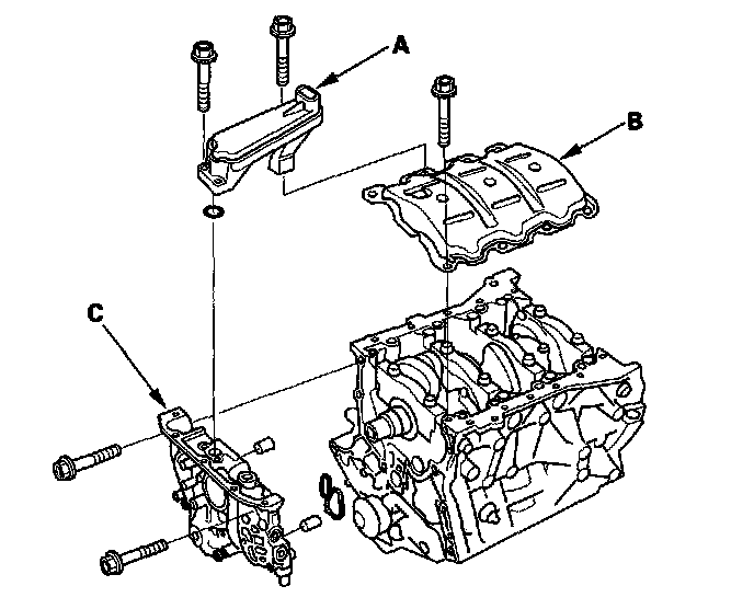 11. Remove the oil screen (A), baffle plate (B), and oil pump (C).