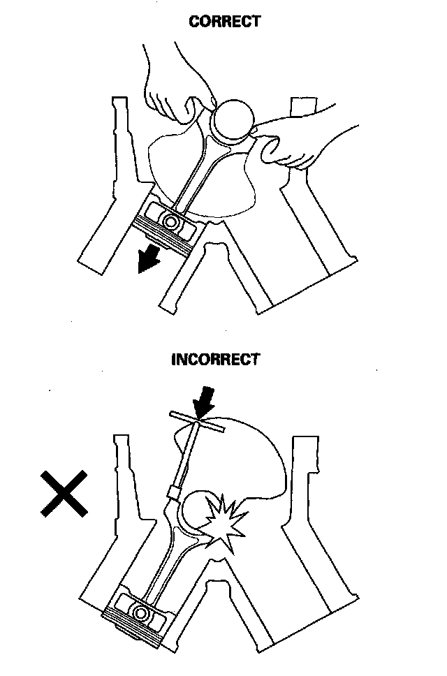 13. Remove the connecting rod caps after setting the crank pin at bottom dead center (BDC) for each cylinder. Remove the piston/connecting rod assembly by pushing on the connecting rod. Take care not to damage the crank pin or cylinder with the connecting rod.