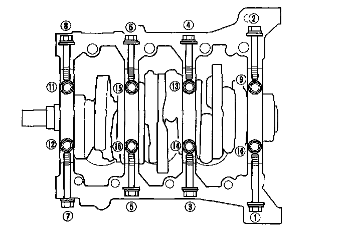 18. Loosen the bearing cap bolts and bearing cap side bolts in sequence 1/3 turn at a time; repeat the sequence until all bolts are loosened.