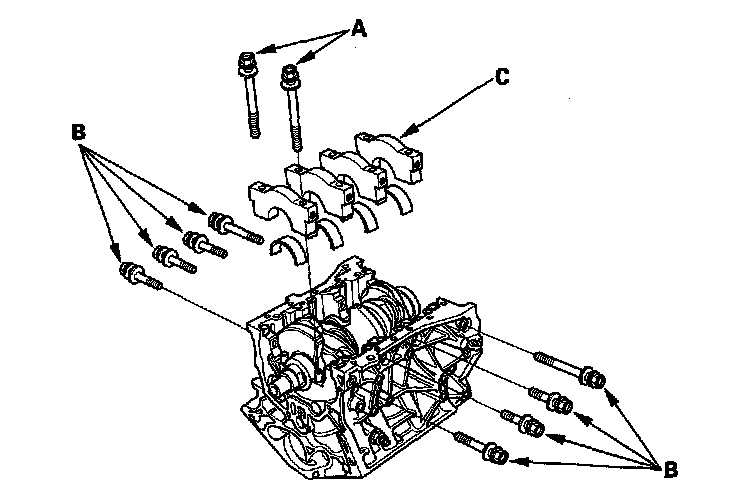 19. Remove the bearing cap bolts (A) and bearing cap side bolts (B), then remove the bearing caps (C).