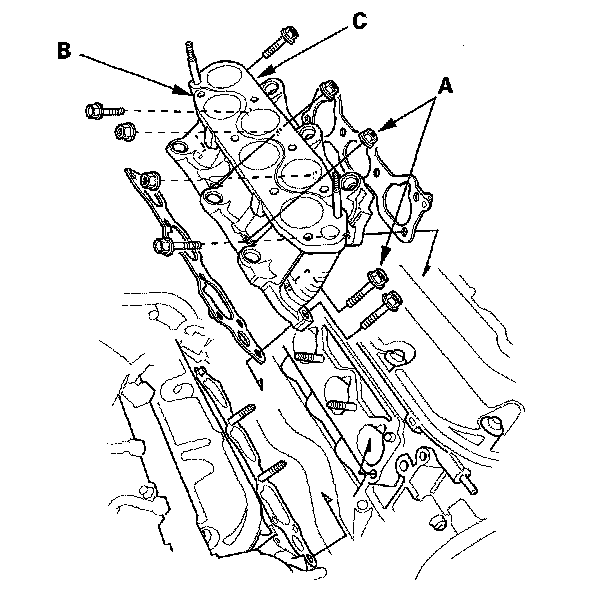 6. Remove the injector base mount bolts/nuts (A), then remove the front injector base (B) and rear injector base (C).