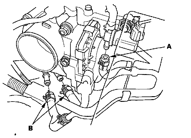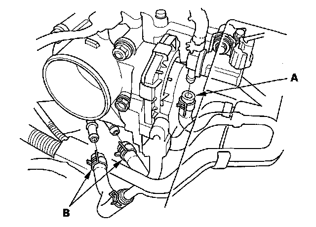 4. Remove the evaporative emission (EVAP) canister purge hose (A) and water bypass hoses (B), then plug the water bypass hoses.