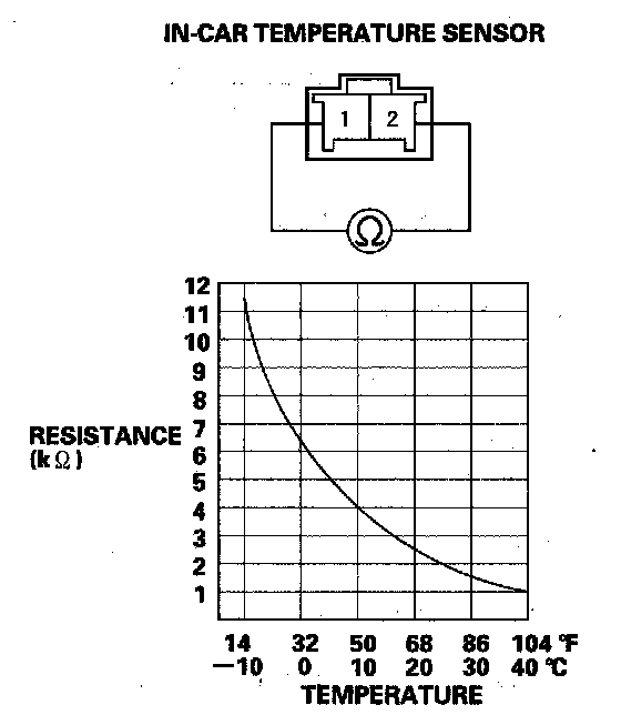 3. Compare the resistance reading between the No. 1 and No. 2 terminals of the in-car temperature sensor with the specifications shown in the graph; the resistance should be within the specifications.
