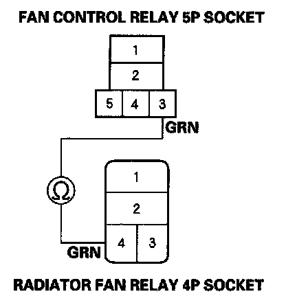 8. Check for continuity between the No. 3 terminal of the fan control relay 5P socket and the No. 4 terminal of the radiator fan relay 4P socket.