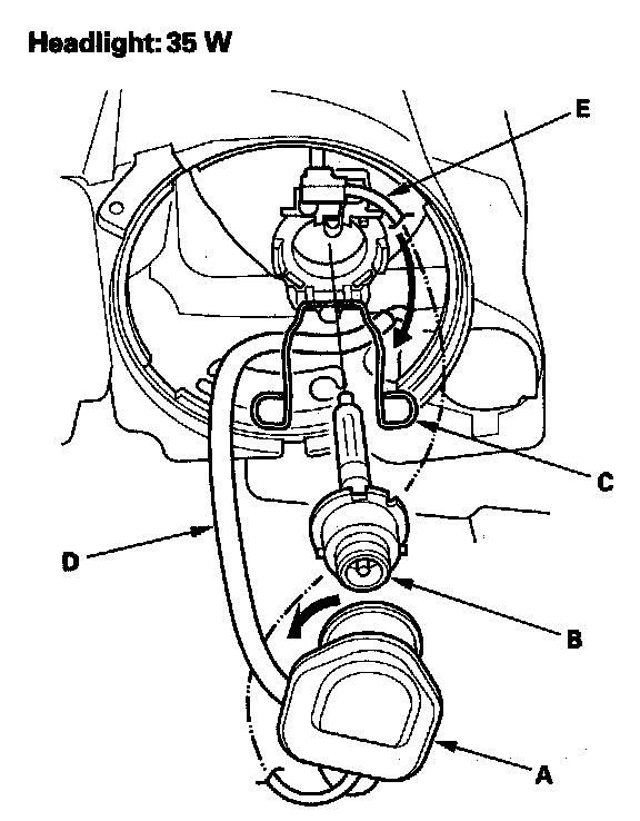 9. Make sure the bulb harness (D) is routed correctly so it does not contact the reflector (E).