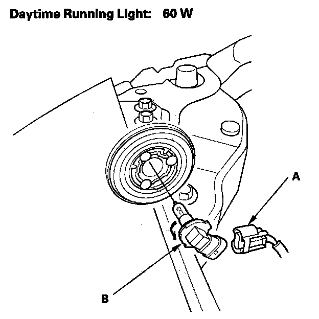 3. Turn the bulb socket (B) 45° counterclockwise to remove it from the headlight housing.