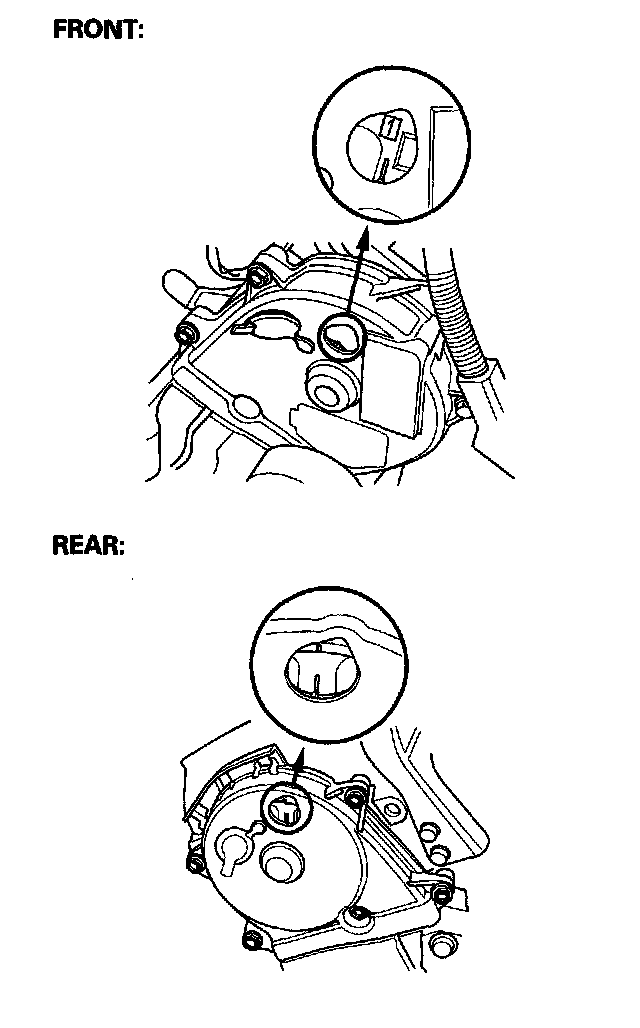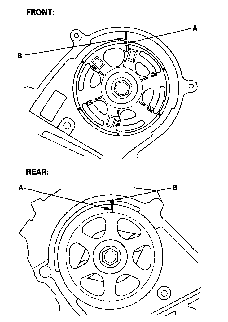 2. Set the timing belt drive pulley to top dead center (TDC) by aligning the TDC mark (A) on the tooth of the timing belt drive pulley with the pointer (B) on the oil pump.