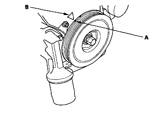 15. Turn the crankshaft pulley so its white mark (A) lines up with the pointer (B).