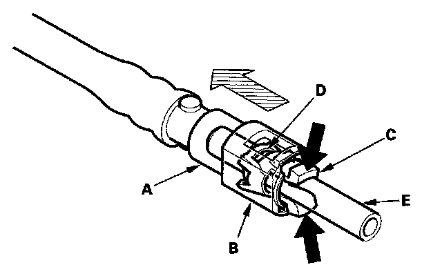 16. Disconnect the quick-connect fitting (A): Hold the connector (B) with one hand, and squeeze the retainer tabs (C) with the other hand to release them from the locking tabs (D). Pull the connector off.