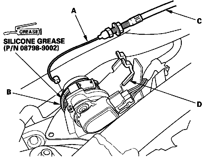 3. Remove the cable housing (C) from the cable bracket (D).