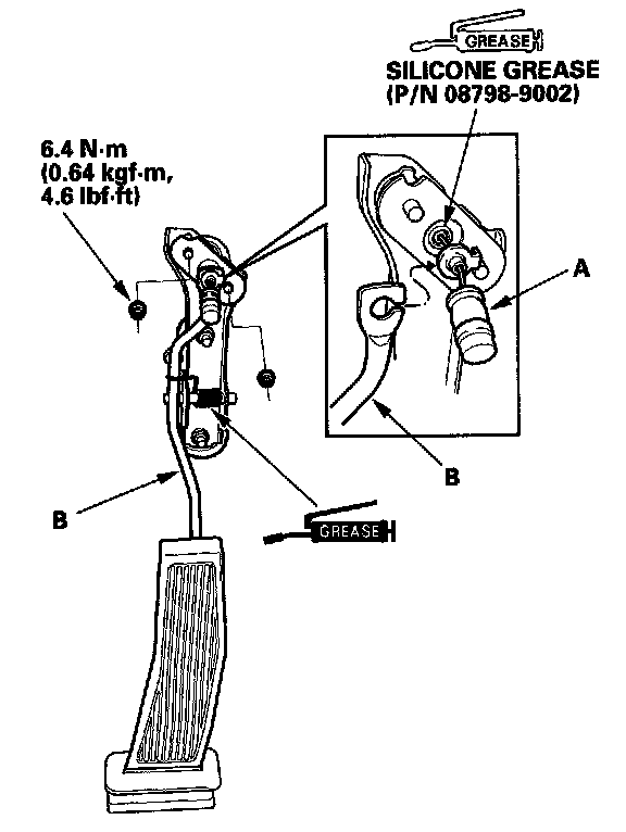 4. Remove the throttle cable (A) from the accelerator pedal (B).