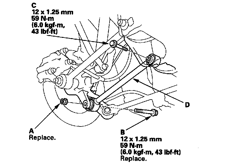 4. Remove the flange bolt (C), then remove the lower arm (D).