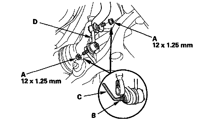 3. Remove the flange nuts (A) while holding the respective joint pin (B) with a hex wrench (C), then remove the stabilizer link (D).