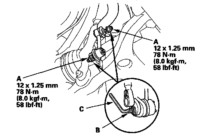 7. Tighten the flange nuts (A) to the specified torque value while holding the respective joint pin (B) with a hex wrench (C).