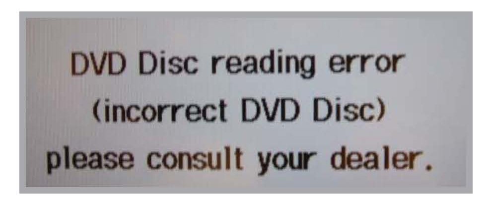 An error message, DVD Disc reading error (incorrect DVD Disc), appears. Remove the patch CD, insert the original navigation DVD, then go to step 10.