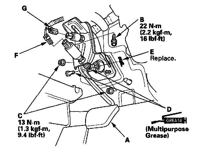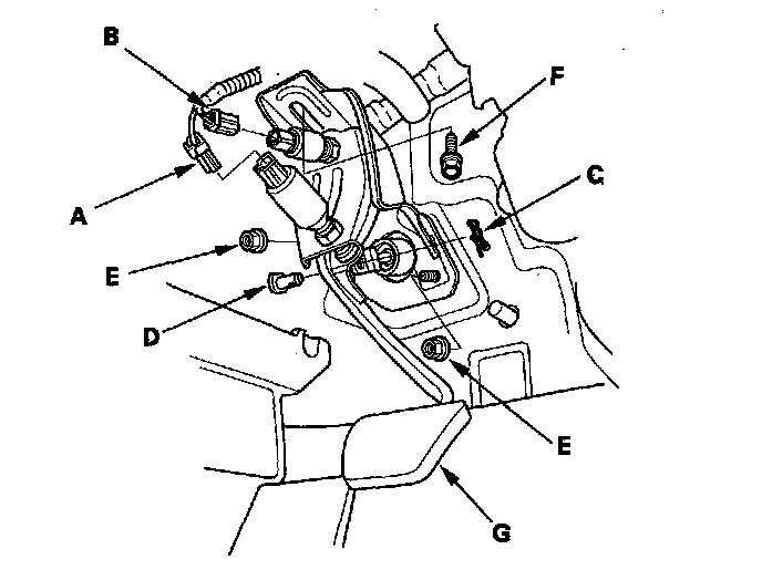 9. Connect the clutch pedal position switch connector (F) and clutch interlock switch connector (G).