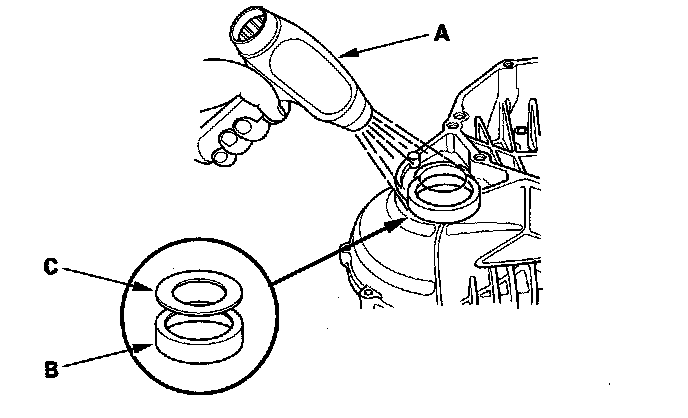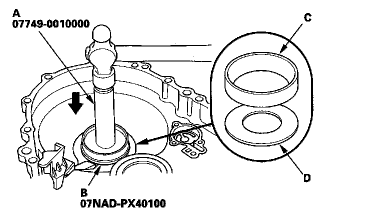 5. If you removed the bearing outer race from the clutch housing, use the driver (A) and 78 x 80 mm attachment (B) to install a new bearing outer race (C) and spacer (D). There should be no space between the bearing outer race, spacer, and housing.