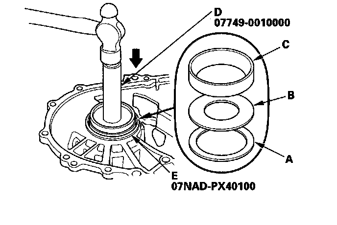 4. Install the 81 mm thrust shim (A), spacer (B), and bearing outer race (C) in the transmission housing by using the driver (D) 78 x 80 mm attachment (E). (Use a new bearing outer race if you replaced the bearing.) There should be no space between the bearing outer race, spacer, and housing.
