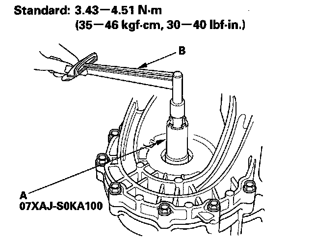 ^ Compare the bearing preload you got on the first try with the specified preload of 3.43 - 4.51 N-m (35 - 46 kgf-cm, 30 - 40 lbf-in.).