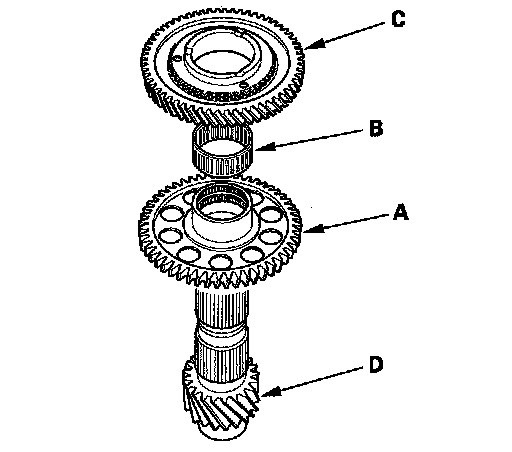 2. Install the countershaft reverse gear (A), needle bearing (B), and 1st gear (C) onto the countershaft (D).