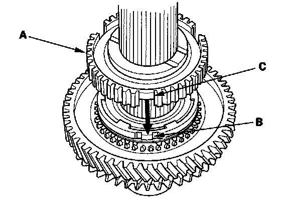 4. Install the 1st/2nd synchro hub (A) by aligning the outer synchro ring fingers (B) with the grooves in the 1st/2nd synchro hub (C).