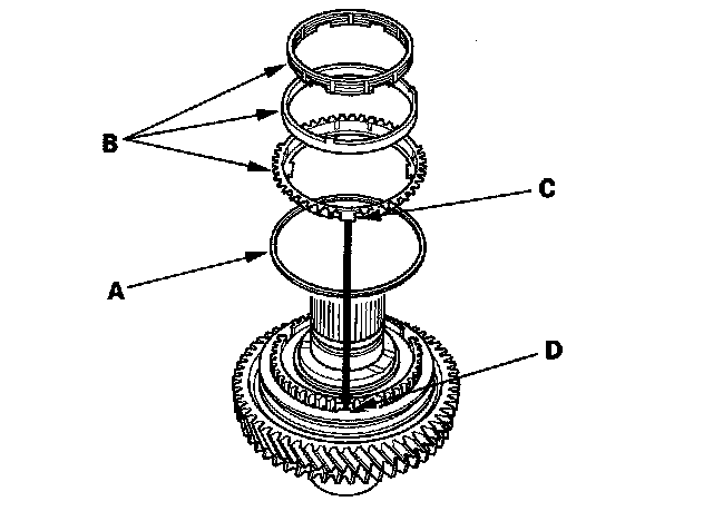 7. Install the triple cone synchro assembly (B) by aligning the outer synchro ring fingers (C) with the grooves in the 1st/2nd synchro hub (D).