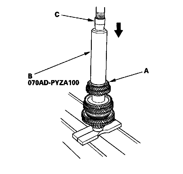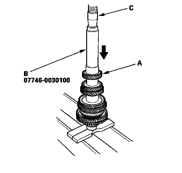 19. Install 6th gear (A) using the 40 mm I.D. driver (B) and a press (C).