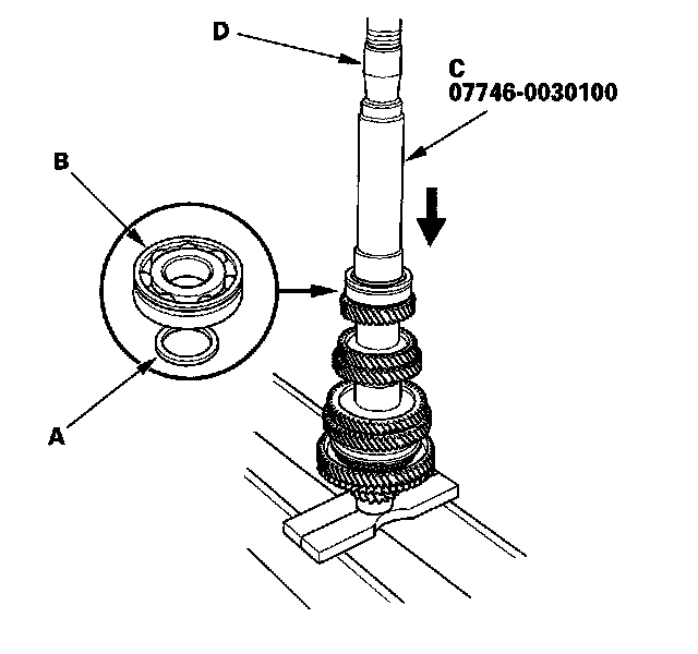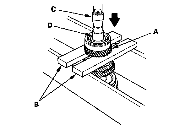 17. Support 6th gear (A) on steel blocks (B), then use a press (C) and an attachment (D) to press the countershaft out of the old ball bearing.
