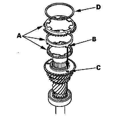 4. Install the double cone synchro assembly (A) by aligning the synchro cone fingers (B) with the holes in 3rd gear (C), then install the synchro spring (D).