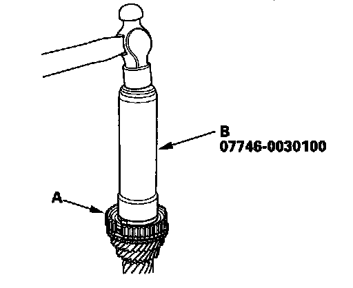 6. Install the 3rd/4th synchro hub (A) using the 40 mm I.D. driver (B).