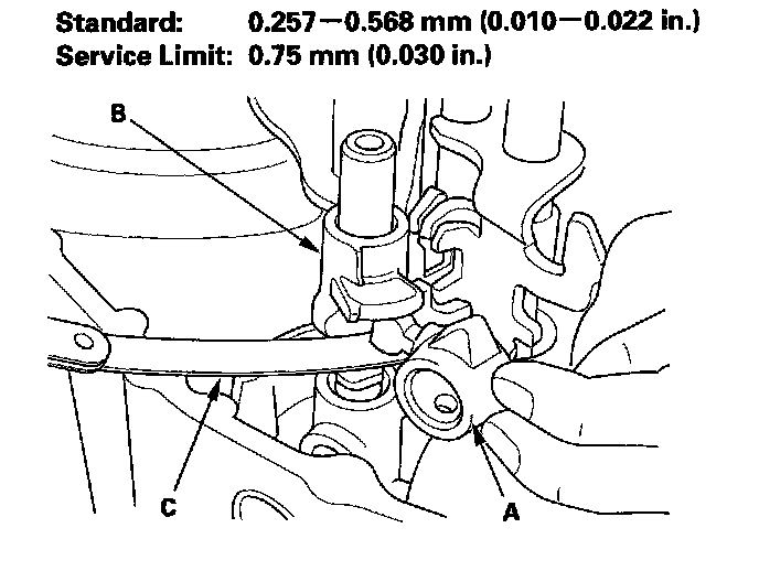 Shift Arm Clearance Inspection1. Measure the clearance between the shift arm (A) and shift piece (B) with a feeler gauge (C). If the clearance is more than the service limit, go to step 2.