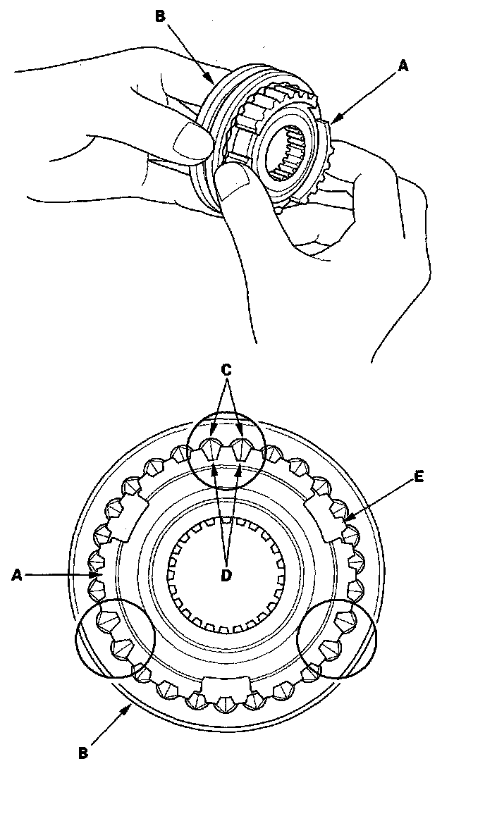 2. Install each synchro hub (A) in its mating synchro sleeve (B), and check for free movement. Make sure you match the three sets of longer teeth (C) (120 degrees apart) on the synchro sleeve with the three sets of deeper grooves (D) in the synchro hub. Do not install the synchro sleeve with its longer teeth in the synchro hub slots (E) because it will damage the spring ring.