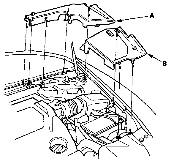 1. Remove the left rear engine compartment cover (A) and the left side engine compartment cover (B).
