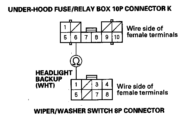 9. Check for continuity between the No. 6 terminal of under-hood fuse/relay box 10P connector K and the No. 1 terminal of the wiper/washer switch (combination switch control unit) 8P connector.