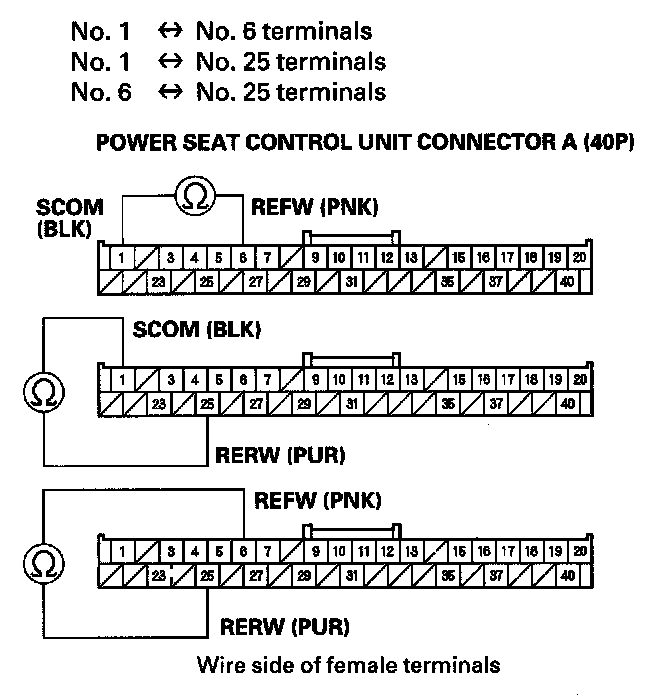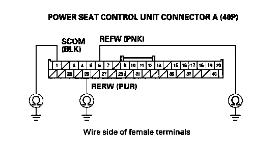 8. Check for continuity between power seat control unit connector A (40P) No. 1, No. 6, No. 25 terminals and body ground.