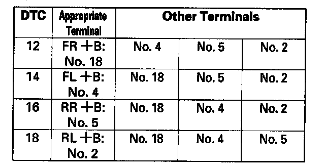 9. Check for continuity between the appropriate wheel sensor +B terminal and other wheel sensor +B terminals (see table).