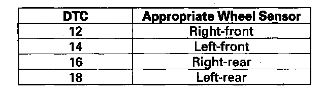 DTC 12, 14, 16, 18: Wheel Sensor (Electrical Noise/intermittent Interruption)NOTE: If the ABS and VSA indicators come on because of electrical noise, the indicator goes off when you test-drive the vehicle at 19 mph (30 km/h) and the system returns to normal.