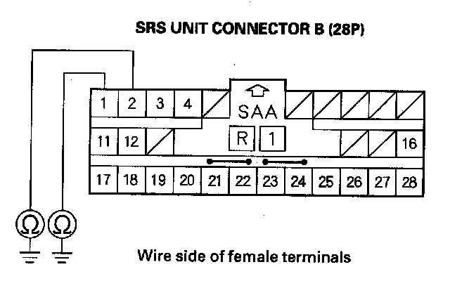 13. Measure the resistance between the No. 1 terminals of SRS unit connector B (28P) and body ground, and between the No. 2 terminal and body ground. There should be an open circuit or at least 1 Mohms.
