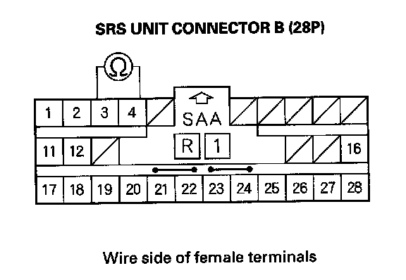 12. Measure the resistance between the No. 3 and the No. 4 terminal of SRS unit connector B (28P). There should be 2.0-3.0 ohms.