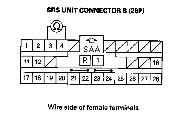 13. Measure the resistance between the No. 3 and the No. 4 terminals of SRS unit connector B (28P). There should be an open circuit or at least 1 Mohms.