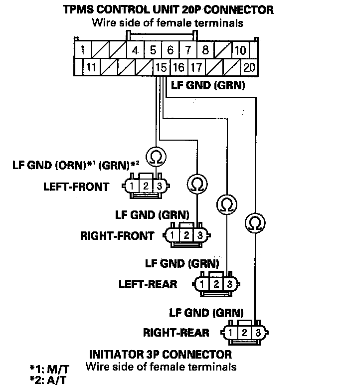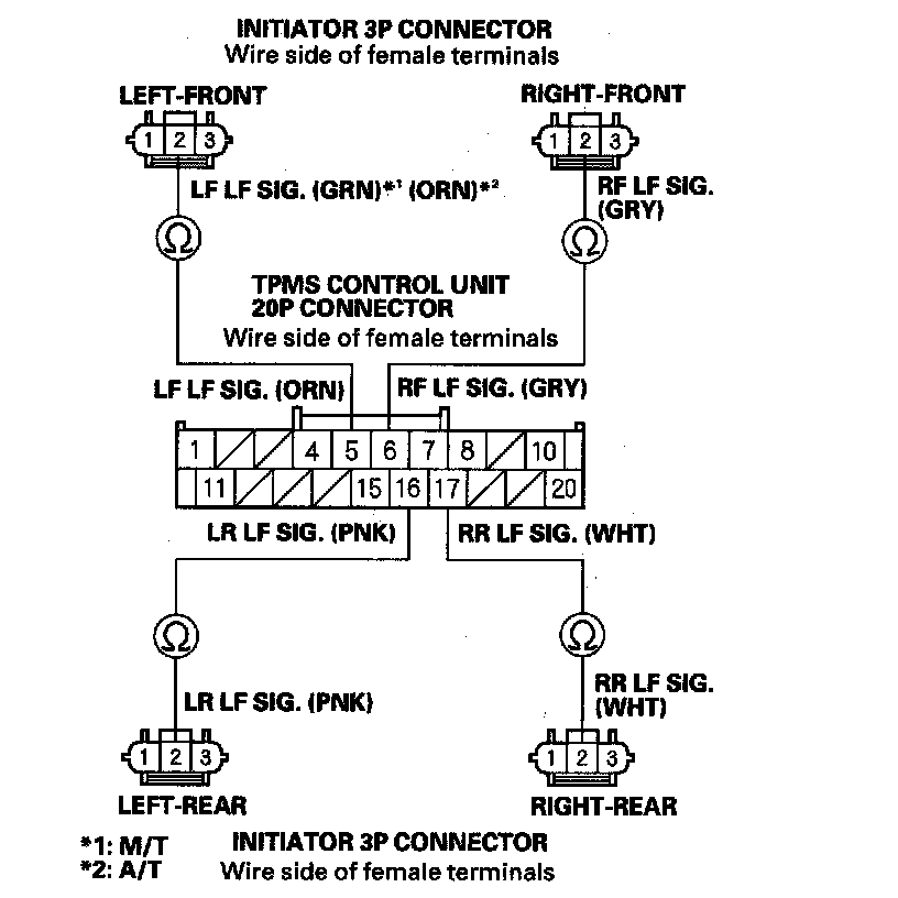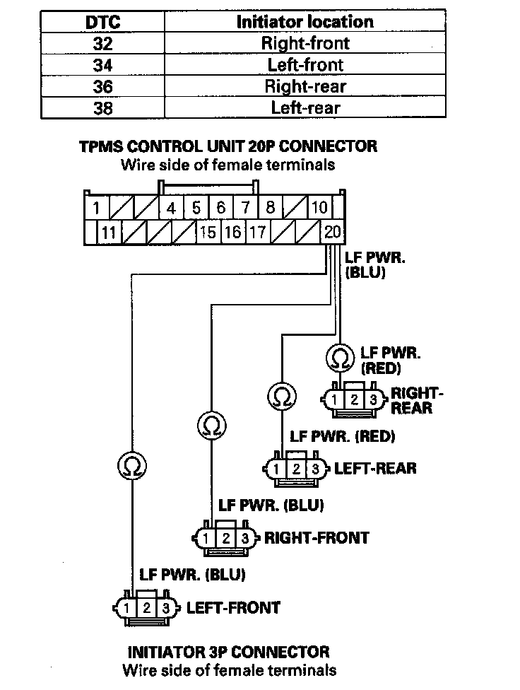 24. Check for continuity between the appropriate TPMS control unit 20P connector terminal and appropriate initiator 3P connector terminal No. 2 (see table).