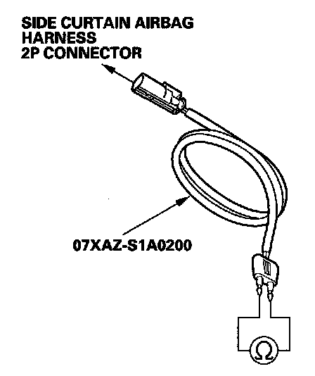 5. Connect the SRS inflator simulator (2 ohms connector) and simulator lead E to the side curtain airbag harness.