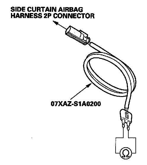 5. Connect the SRS inflator simulator (2 ohms connector) and simulator lead E to the side curtain airbag harness.