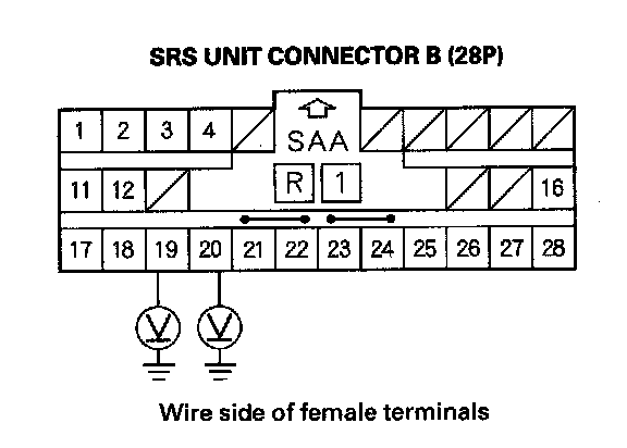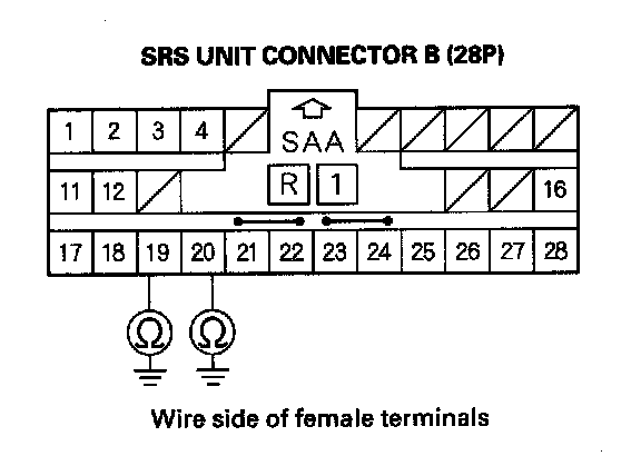 9. Measure the resistance between the No. 19 terminal of SRS unit connector B (28P) and body ground, and between the No. 20 terminal and body ground. There should be an open circuit or at least 1 Mohms.
