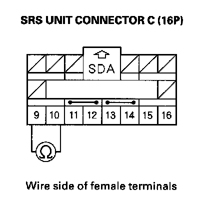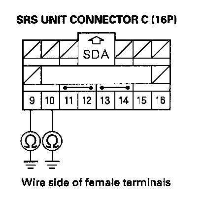 9. Measure the resistance between the No. 9 terminal of SRS unit connector C (16P) and body ground, and between the No. 10 terminal and body ground. There should be an open circuit or at least 1 Mohms.