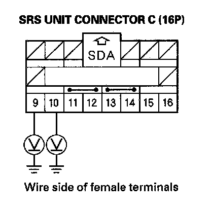 12. Measure the voltage between the No. 9 terminal of SRS unit connector C (16P) and body ground, and between the No. 10 terminal and body ground. There should be 1 V or less.