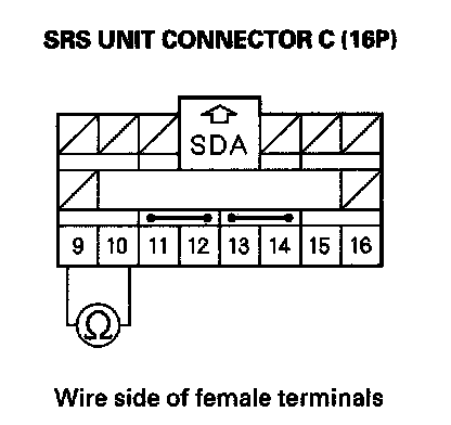 8. Measure the resistance between the No. 9 and No. 10 terminals of SRS unit connector C (16P). There should be an open circuit or at least 1 Mohms.
