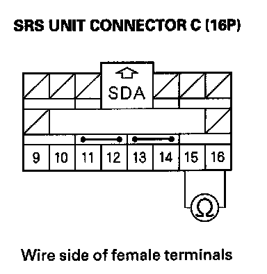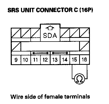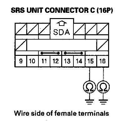 9. Measure the resistance between the No. 15 terminal of SRS unit connector C (16P) and body ground, and between the No. 16 terminal and body ground. There should be an open circuit or at least 1 Mohms.