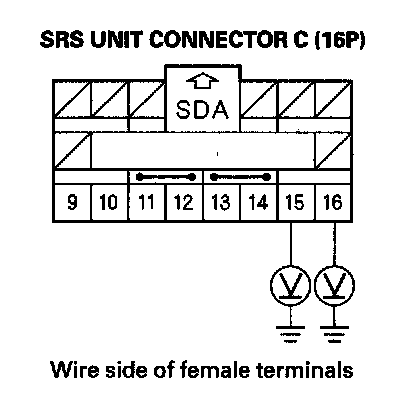 12. Measure the voltage between the No. 15 terminal of SRS unit connector C (16P) and body ground, and between the No. 16 terminal and body ground. There should be 1 V or less.