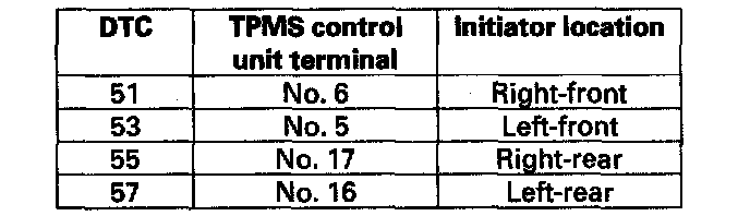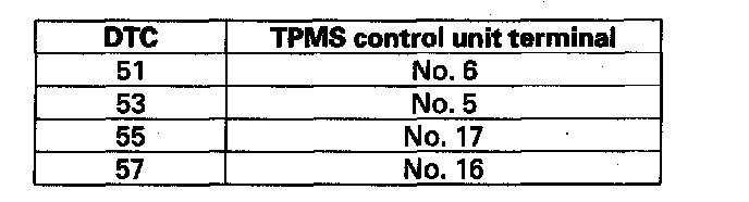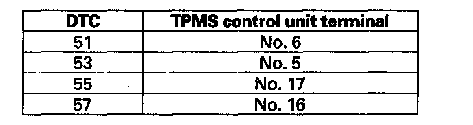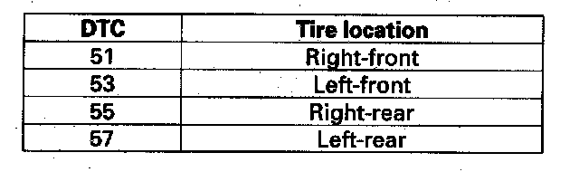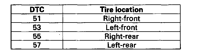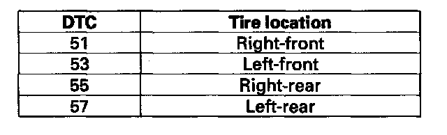 DTC 51, 53, 55, 57: Tire Pressure Sensor Registration ErrorNOTE: These DTCs will only set during initialization with the HDS.